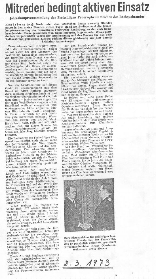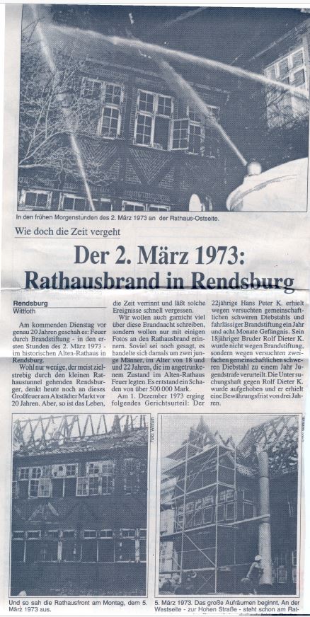 Durch ein großes Schadensfeuer im Alten Rathaus in Rendsburg ist in der Nacht zum 2.März viel wertvolles, zum Teil unersetzliches Museumsgut vernichtet oder sehr schwer beschädigt worden. Im Jahre 1932 wurde ein Teil der Räume des Alten Rathauses dem Heimatmuseum für seine Zwecke zur Verfügung gestellt. Die Verwaltung war damals in das heutige Rathaus umgezogen.