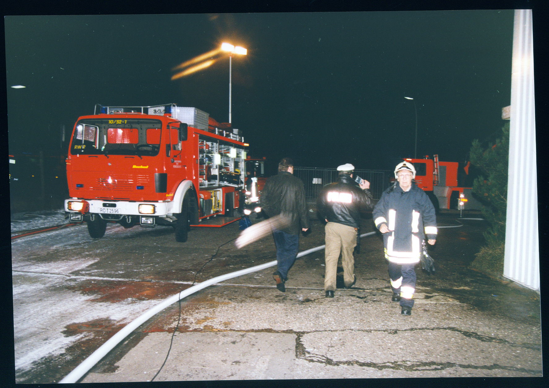 Während wir uns sammelten, hatte unser Kamerad Klaus-Dieter Schwerdt ganz andere Sorgen. Der gute Klaus war an diesem Tag nicht einfach Maschinist – nein, er war Fahrdienstleiter Schwerdt. Da viele Maschinisten in den ersten Fahrzeugen schon im Innenangriff oder mit Wasserversorgung beschäftigt waren, blieb Klaus nichts anderes übrig, als sich hinter jedes noch freie Lenkrad zu klemmen. Er fuhr ein Fahrzeug nach dem anderen zur Einsatzstelle, parkte sie ein, übergab sie an die Maschinisten – und weiter ging’s.