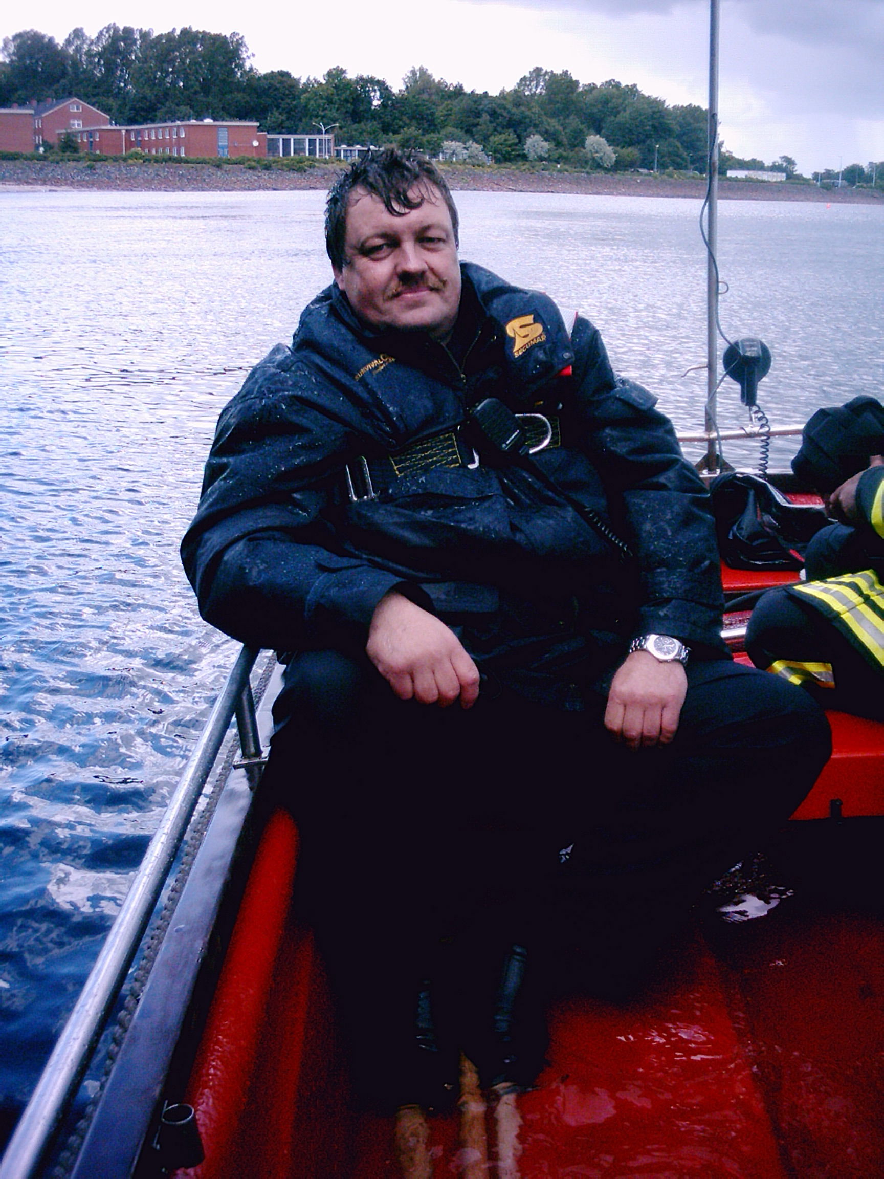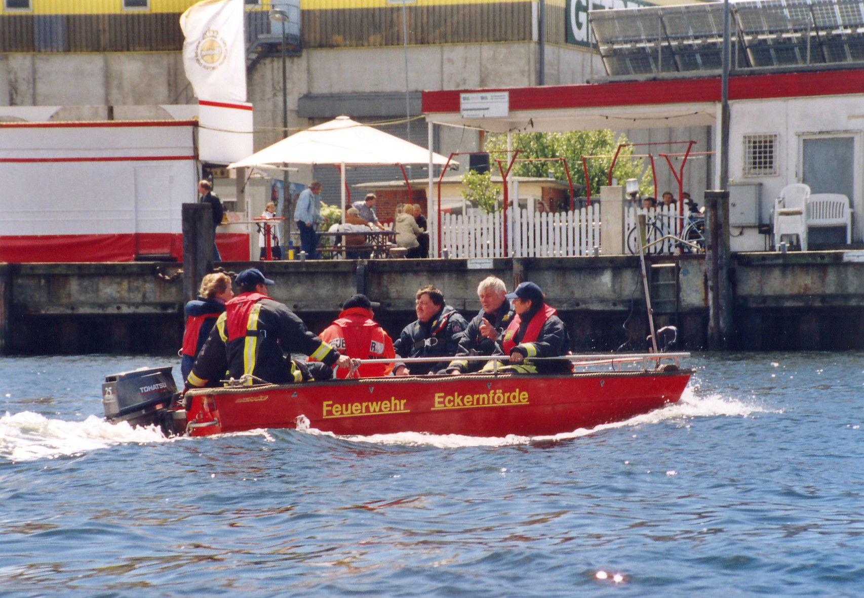 Und während wir wie die Wahnsinnigen schöpften, zog die Feuerwehr Eckernförde mit ihrem prächtigen Boot an uns vorbei – auf dem Weg in den sicheren Hafen. Wir winkten. Sie auch. Nur leider in entgegengesetzte Richtung.